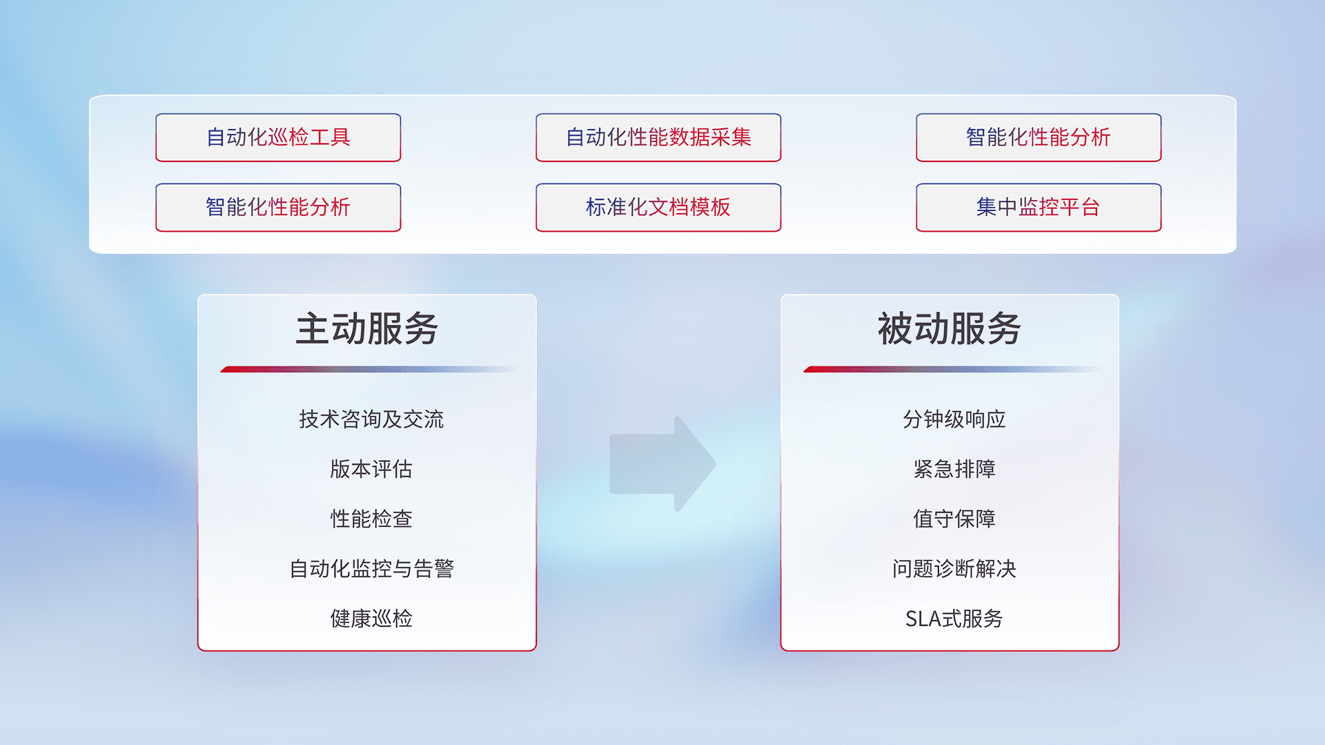 智能化工具和标准化文档,,,保障服务质量,,提供主动服务(包含技术咨询、、、、版本评估、、、、性能检查、、、、自动化监控与告警、、健康巡检)和被动服务包含(分钟级响应、、、紧急排障、、、、值守保障、、、问题诊断解决、、、、SLA服务)。。。。